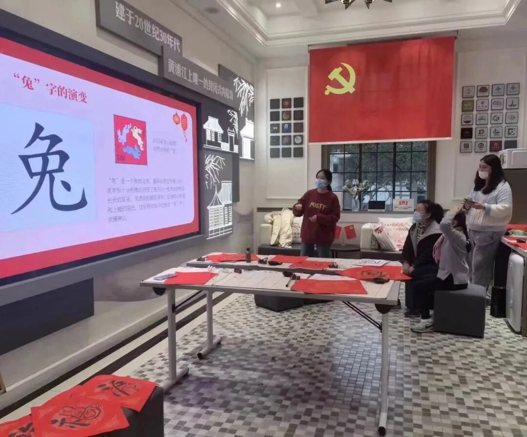 在春节来临之际,上海出版印刷高等专科学校抱朴书法社社长吴悠同学在复兴岛公园党群服务站开启了文化传承的春节实践体验,利用自己书法特长,变身书法“小达人”,开展“瑞兔送福写春联”活动。她为到场的游客讲解“兔”字的字形演变,和小朋友们一起书写兔年创意“福”字、春联,引导小朋友体验着汉字中一撇一捺的文化魅力。随后,吴悠同学还与社区居委会干部一起带着大大的“福”字来到了社区高龄独居百岁老人们的家中送“福”。