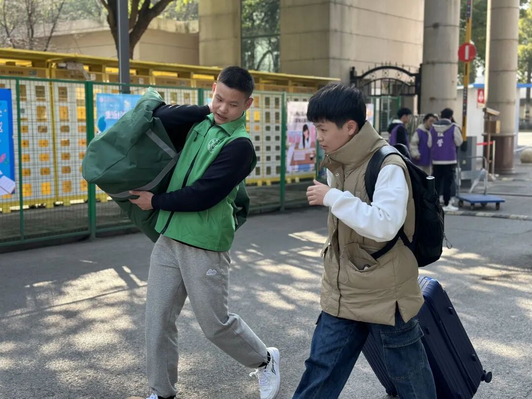 志愿者为返校学生搬运行李