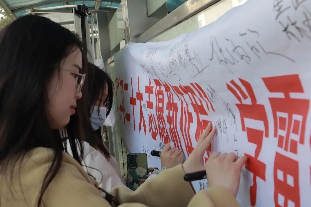 同学们在活动主题横幅上签名