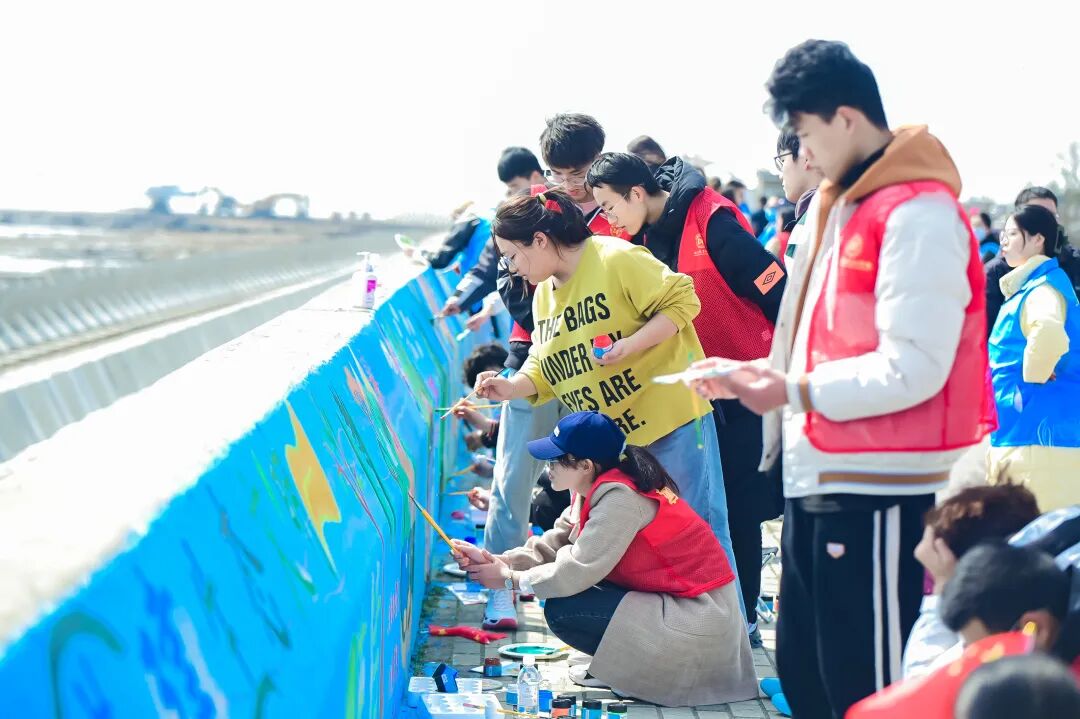 学生志愿者们在海堤上创作学雷锋主题绘画