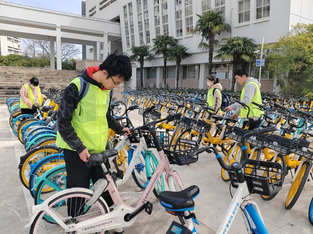 志愿者在校园中整理共享单车