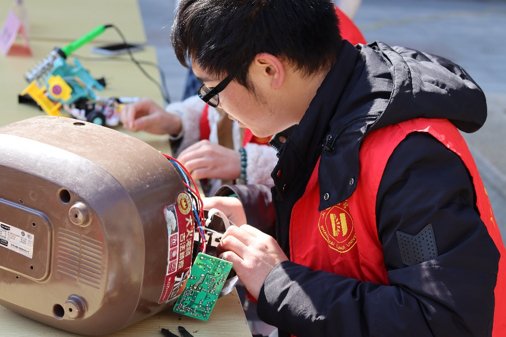 上海电机学院志愿者进社区向居民提供测量血压志愿服务,普及健康知识,关爱居民健康生活。电气学院“科学商店”志愿服务队利用在校所学专业技能现场为居民提供小家电维修志愿服务,爱心伴初春,接力展“锋”采。