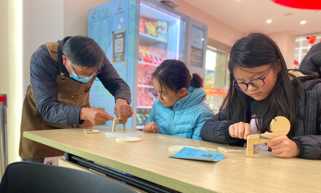 ”上海工匠”、学校关工委指导团成员、木工大师工作室负责人顾惠明在杨行镇党群服务中心授木艺课