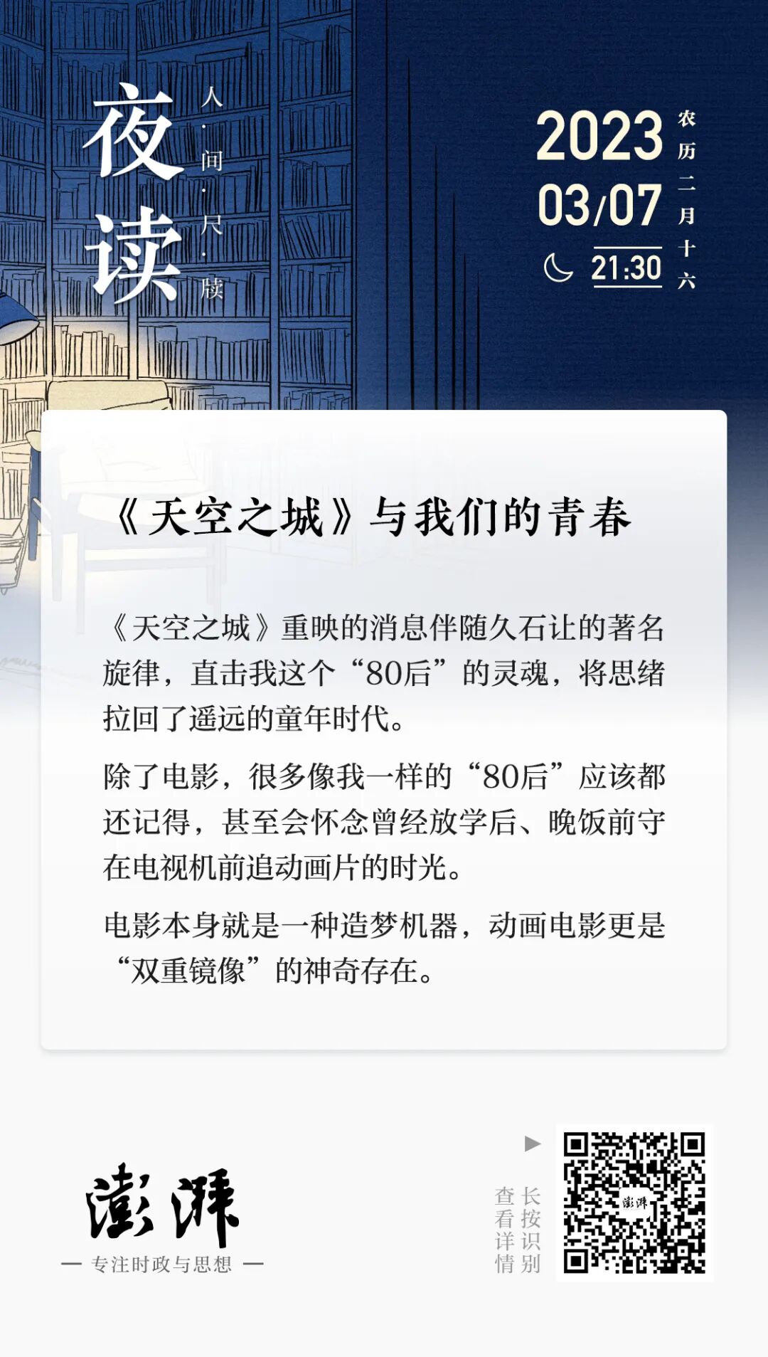 前几天,宫崎骏经典动画电影《天空之城》发布了中国内地重映海报及预告片,定档6月1日儿童节。这一消息伴随久石让的著名旋律,直击我这个“80后”的灵魂,将思绪拉回了遥远的童年时代。