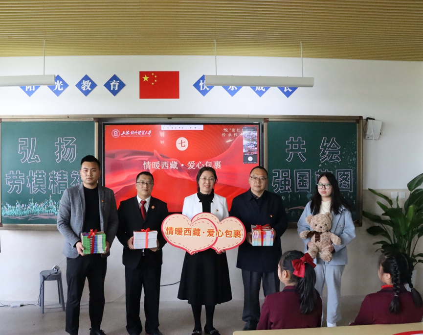 情暖西藏,点亮梦想。活动中,上经贸大工商管理学院、上戏松江附校共同向西藏定日县第二初级中学的同学们赠送了一批书籍和学习文具,将传承劳模精神与弘扬“沪藏一家亲”的思想紧密结合,也加深了两地大中小学青年学子的情感联系。