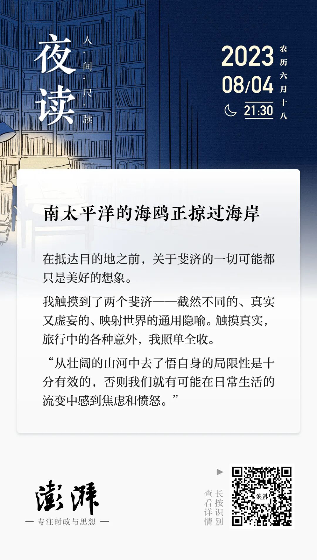 “如果这个世界不公平,或让人无法理解,那么壮阔的景致会提醒我们,世间本来就是如此,没有什么好大惊小怪的。宇宙的力量可以移山倒海,而人类不过是小小的玩偶。”比起毒鸡汤,我更愿意给朋友转发阿兰·德波顿的至理名言:“从壮阔的山河中去了悟自身的局限性是十分有效的,否则我们就有可能在日常生活的流变中感到焦虑和愤怒。”