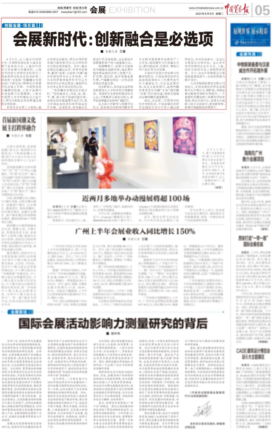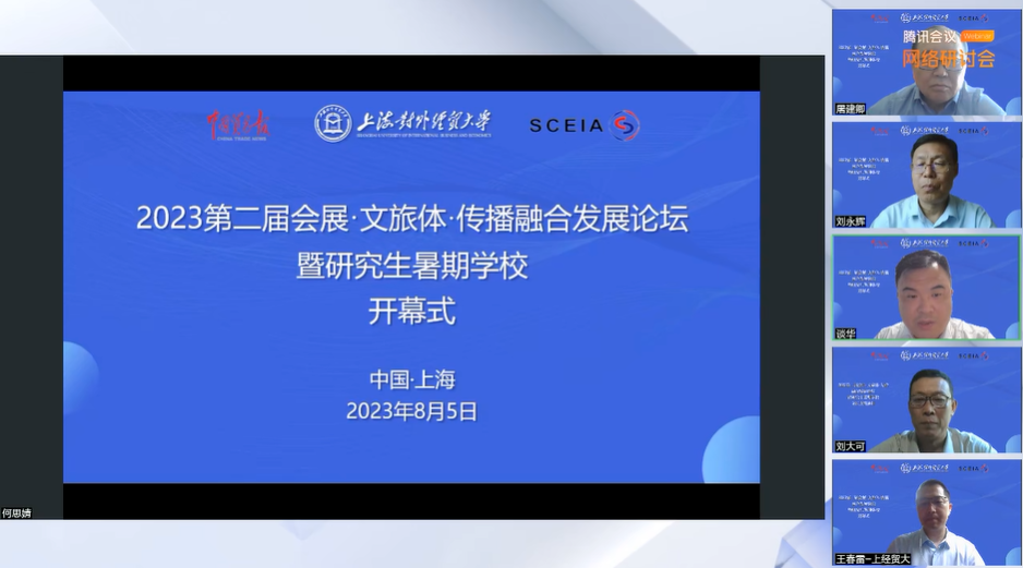 8月5日,由上海对外经贸大学、中国贸易报社和上海市会展行业协会主办,上海对外经贸大学会展与传播学院、上海对外经贸大学研究生院和长三角会展研究院承办的2023第二届会展·文旅体·传播融合发展论坛(下称论坛)暨研究生暑期学校在线上开幕。中国贸易报总编辑范培康,上海市会展行业协会秘书长屠建卿,上海对外经贸大学学科建设办公室主任、研究生院院长刘永辉通过视频分别致辞。