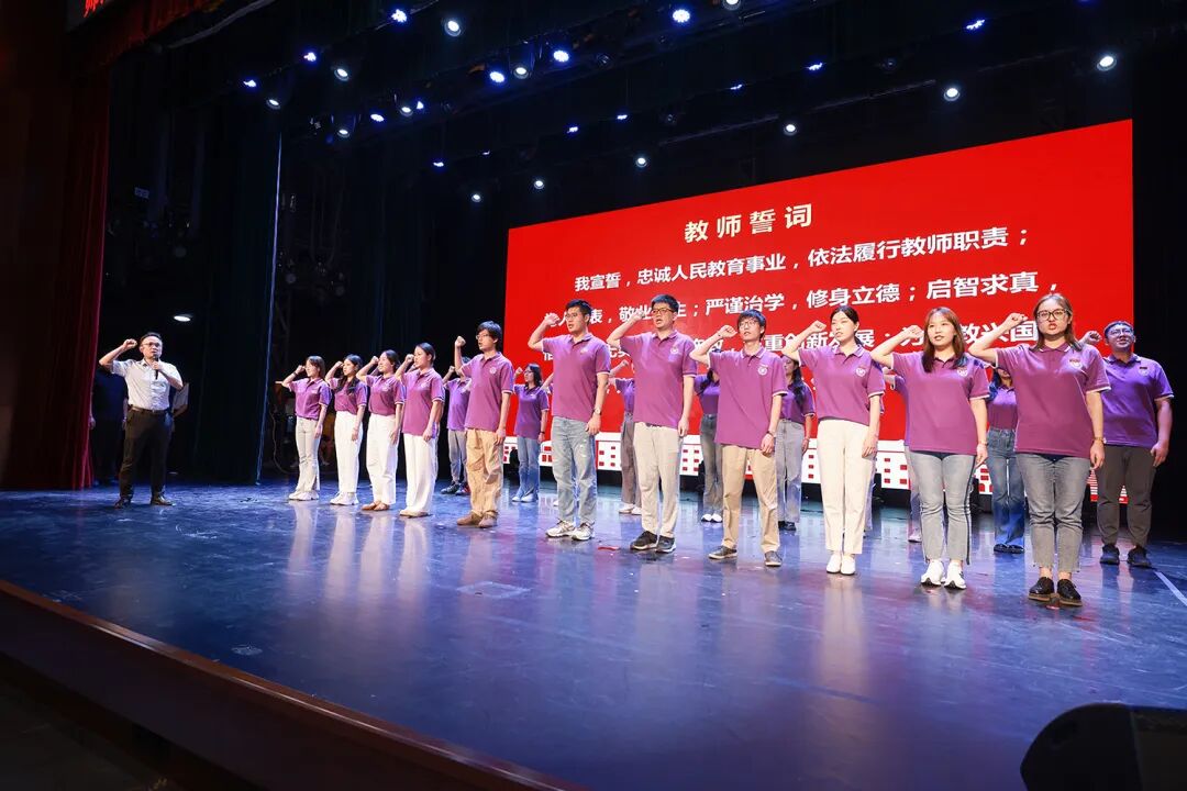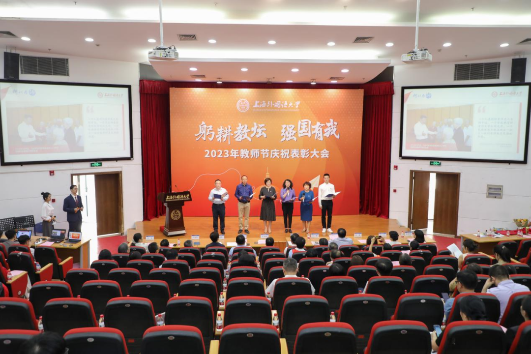 上海外国语大学贤达经济人文学院举行2023年教师节庆祝大会,对72位优秀教师进行表彰。全体新教师进行庄严宣誓。