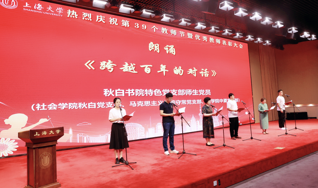 上海大学举行庆祝第39个教师节表彰大会。秋白书院特色党支部师生党员为大家带来的原创诗朗诵《跨越百年的对话》,展现了光年流转中,上海大学的红色基因代代相传,上大师生为民族之振兴、国家之富强拼搏奋斗。