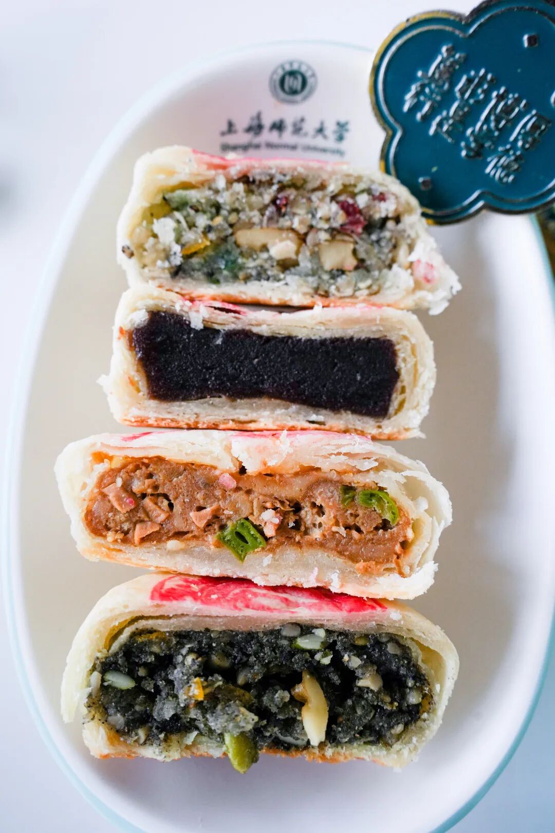 上海师范大学今年中秋推出苏式月饼和桃山皮月饼两类。苏式月饼包括百果和豆沙、鲜肉和椒盐四种口味,甜咸皆宜。桃山皮月饼则有双色黄金皮绿豆沙流心、双色樱花皮香芋流心、双色抹茶皮海盐芝士流心等口味。