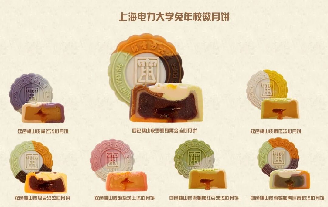 上海电力大学今年推出兔年校徽月饼,口味丰富,品类多样。在广式五仁、豆沙及现烤鲜肉等传统口味的基础上,推出了流心口味的桃山皮月饼,并搭配新潮流行口味。形如满月,蕴含了中国传统的美好愿景;或甜或咸,寄以一份浓浓乡情;校徽以伴,与天南海北的上电人共赏月、共度中秋夜。