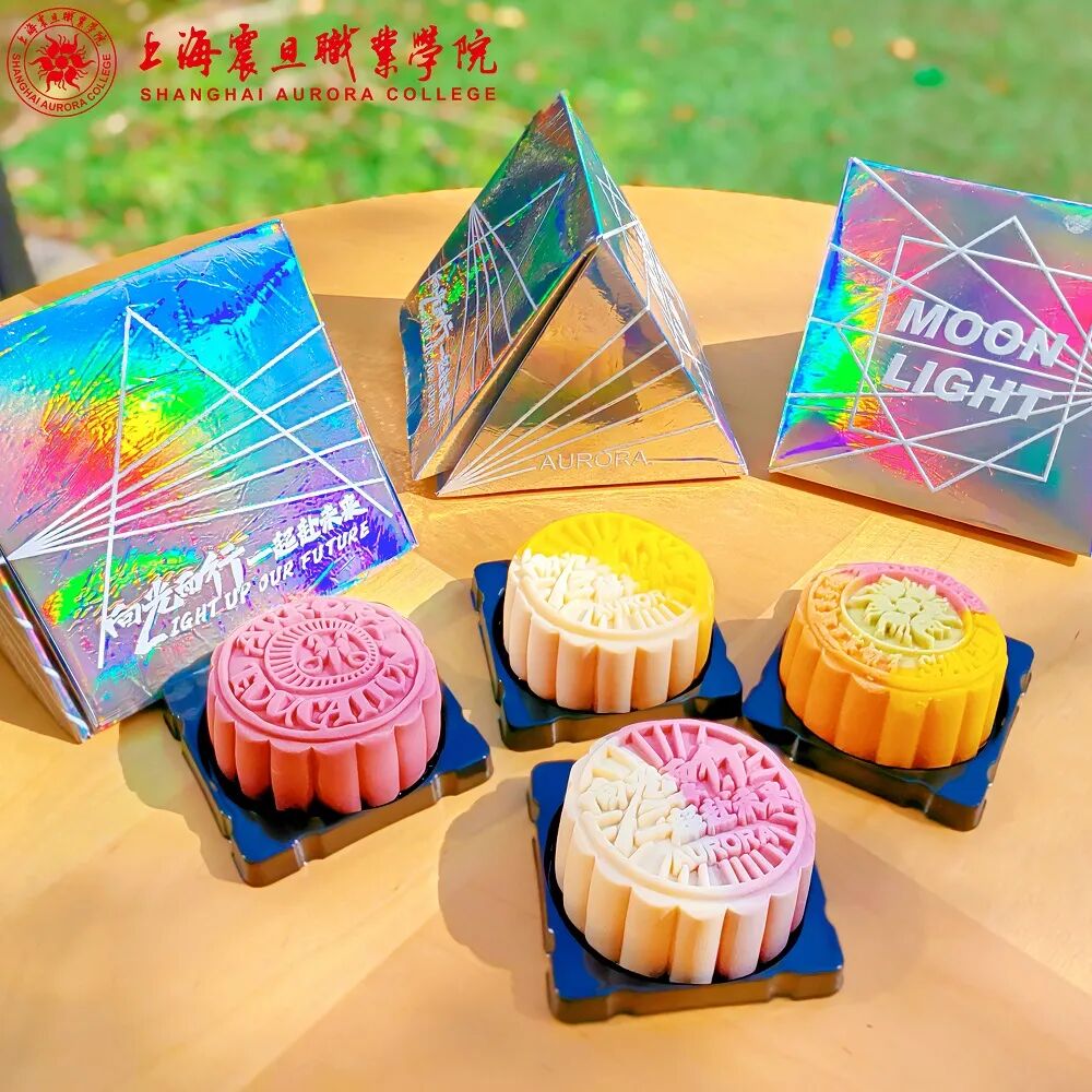 今年上海震旦职业学院的中秋月饼设计概念来自于“三棱镜”,包装材质是激光镭射膜,凸显“向光而行”的主题。月饼的口味选用今年的网红口味,受到学生的好评和喜爱。此外,学校举办中秋“耶”主题活动,有中秋夜市、传统文化体验,活动现场不仅有夜市、文化体验,更有炫目的艺术演出、互动小游戏作为彩蛋出场。