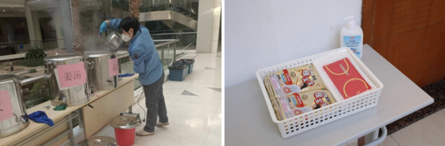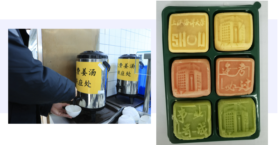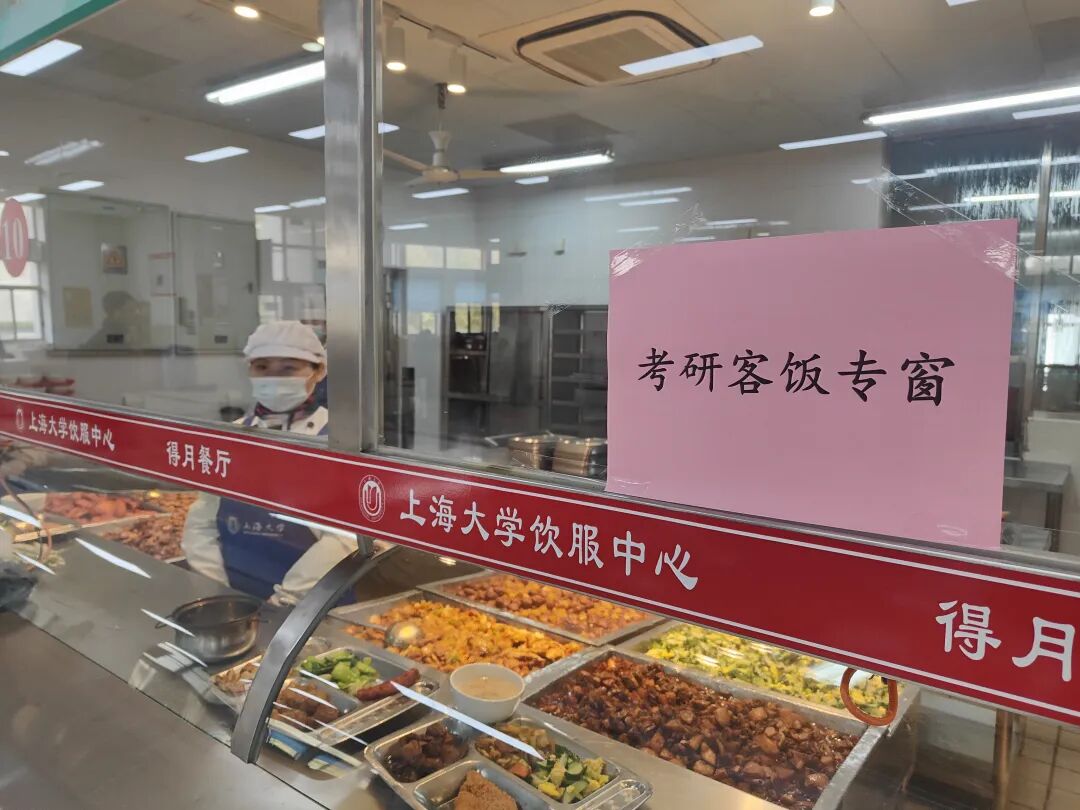 上海大学食堂联合网络平台开设提前线上预订餐食服务,研究生考试期间午餐时段在食堂楼门口设置线上预订餐核销点、临时餐券售卖点,做好分流引导,加快排队速度,保障供餐顺利,并提前做好信息发布,保障研究生考试的考生用餐顺利。指定供餐食堂及所有值班食堂都准备暖心姜茶供应,加装棉门帘,保证室温不低于20度。水秀楼食堂还延长供应时间,大厅下午持续开放,为考生准备一个温暖、舒适的休息、温习空间。