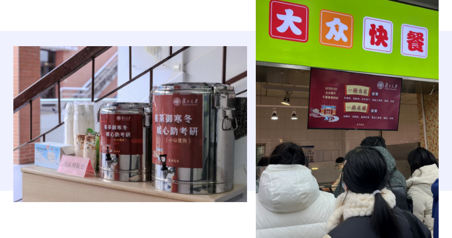 本着为尽可能为考生提供便利的原则,复旦大学在考试日中午开放5个食堂8个楼层,供考生就餐;开放教学楼多个教室和5个大型报告厅,供考生备考休息;总务部门还在食堂和每栋教学楼内准备了御寒姜汤,供考生取用。