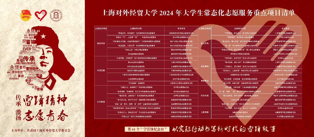 今年3月5日,是第61个“学雷锋纪念日”暨第25个“中国青年志愿服务日”,沪上各高校积极响应号召,开展各项志愿服务活动,师生们以实际行动践行雷锋精神,让雷锋精神在新时代绽放更加璀璨的光芒。