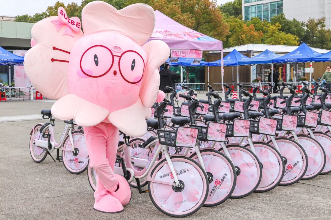 值得一提的是,今年学校还和“哈啰单车”推出了50辆联名款粉色共享单车,车头的粉色风车齐刷刷迎风转动,宛如一道靓丽的风景线。樱花节专属IP“贸小樱”人偶则挥舞着双手邀请师生们前来骑行,本次联名活动还设计了赏樱打卡点,师生们骑着樱花单车游览校园,体验各处樱花的诗情画意。