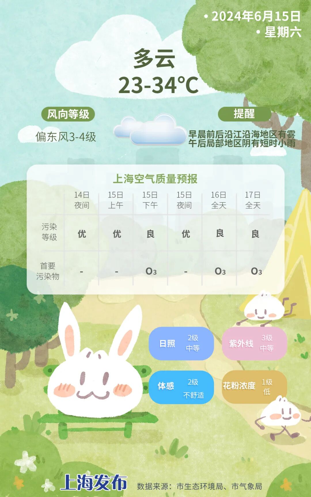 明天以多云为主,随着副热带高压东移北抬,气温将再上一台阶,最高气温可达34度,最低气温23度。午后大气能量堆积,可能触发局部短时小雨,出门备好小伞,防晒防雨两不误。温馨提示:明天早晨前后沿江沿海地区有雾。注意出行安全。