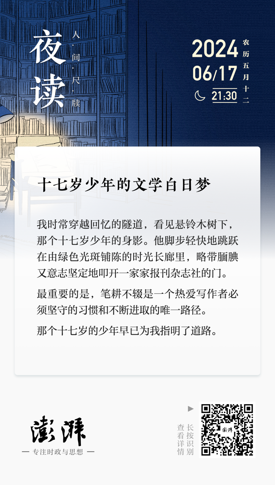 我时常穿越回忆的隧道,看见稠密的悬铃木树下,那个十七岁少年的身影。他脚步轻快地跳跃在由绿色光斑铺陈的时光长廊里,手心攥着一本硬面抄,略带腼腆又意志坚定地叩开一家又一家报刊杂志社的门。