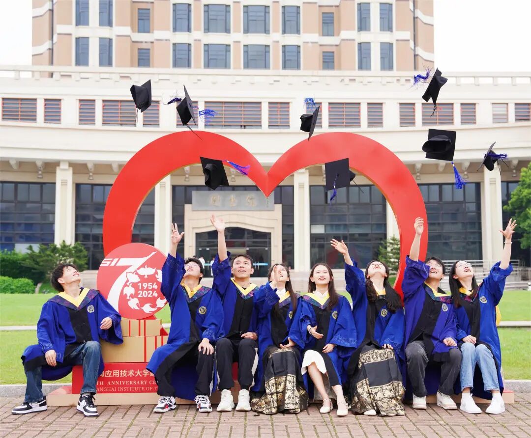 上海应用技术大学毕业生在学校七十周年校庆标识前,将学士帽高高抛起,未来定要“飞得更高”对于上海政法学院毕业生来说,上政法学楼是毕业“打卡”的热门之选,因为在这里获得的知识,将惠及一生上海电子信息职业技术学院实训楼前,毕业生们自信走向未来
