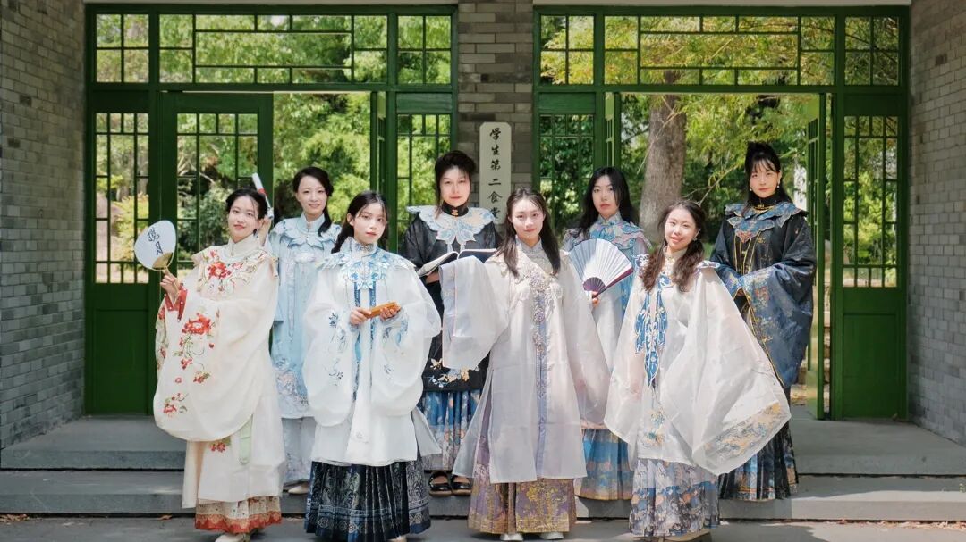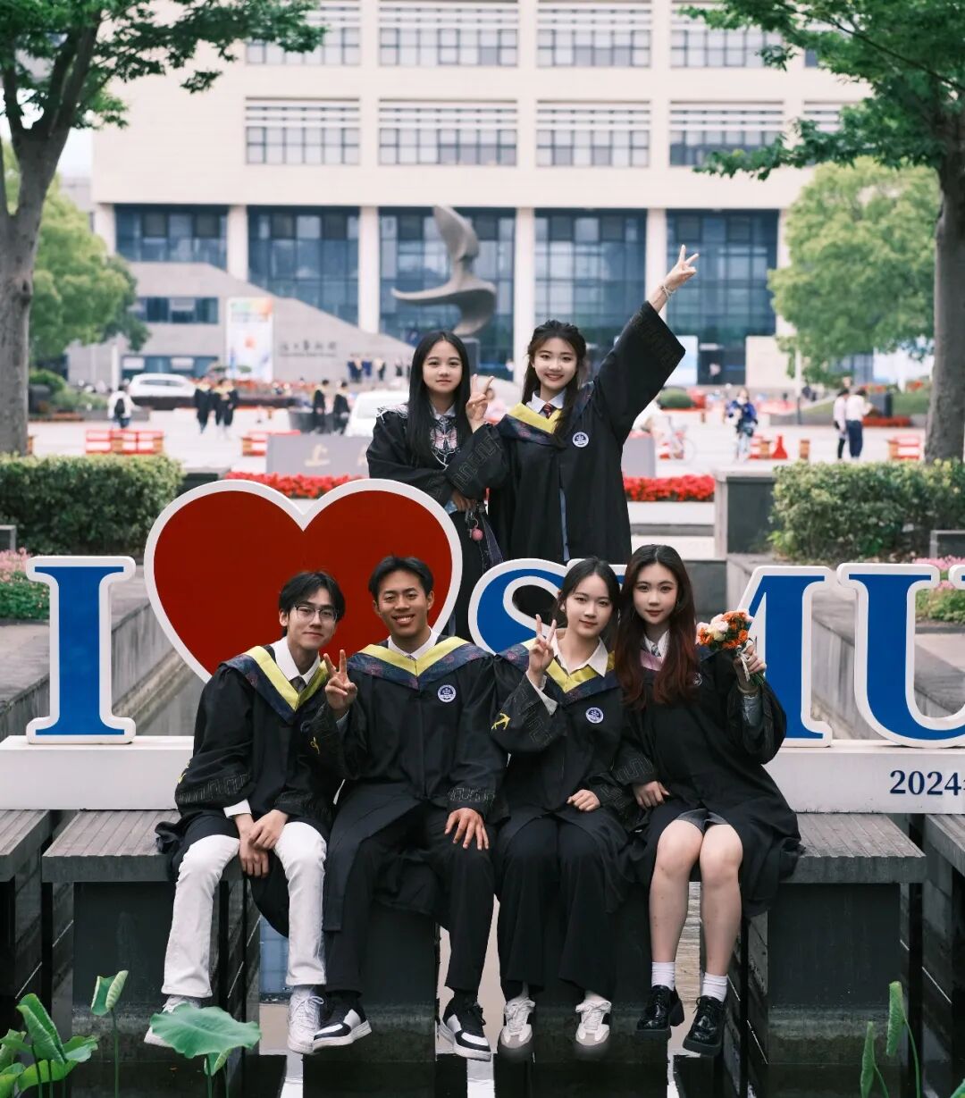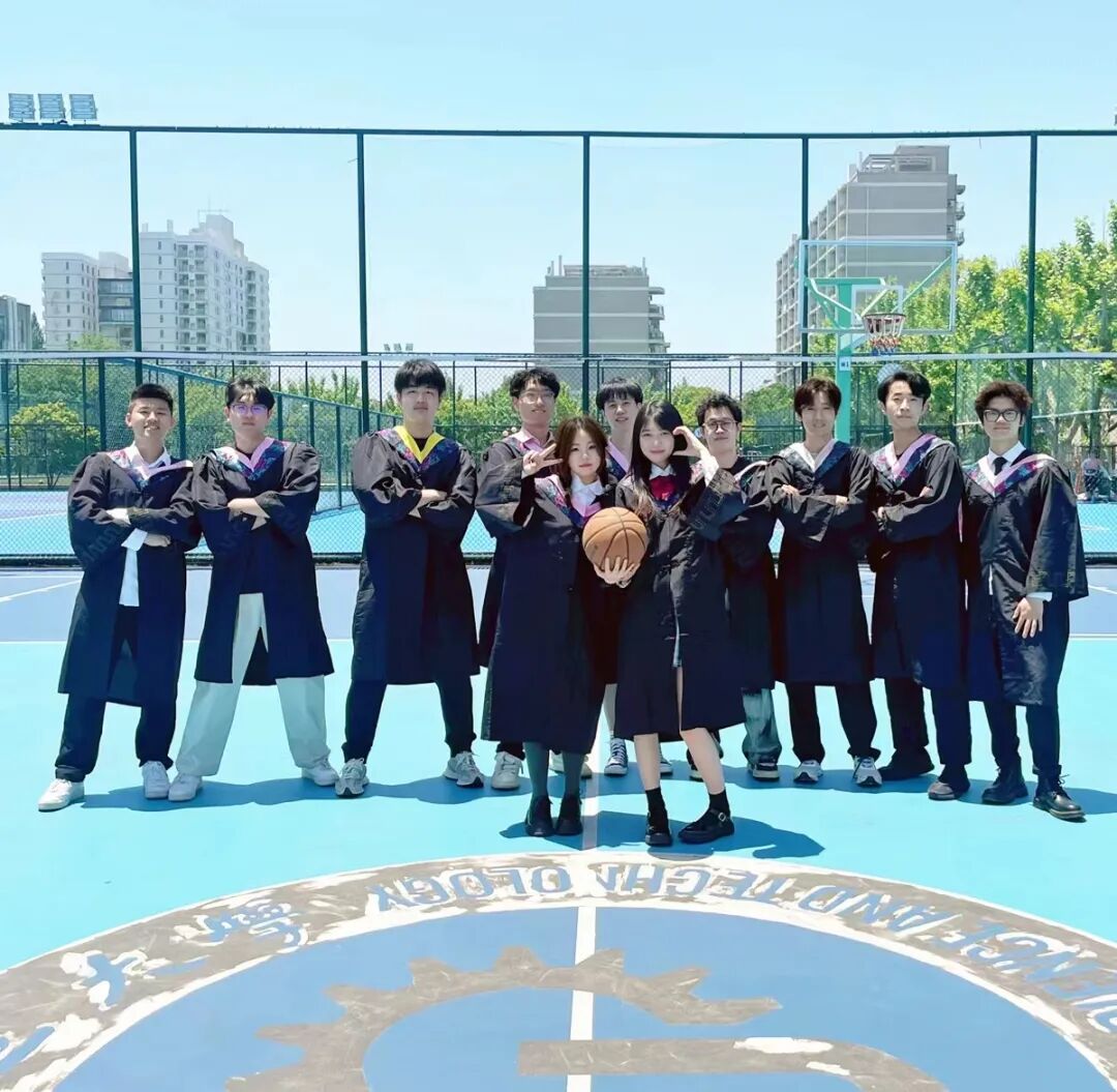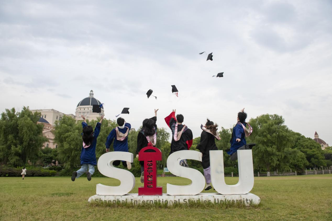华东理工大学毕业生们在篮球场上合影,纪念曾经与篮球有关的时光以“SISU”为背景,上海外国语大学毕业生们一跃而起,定格毕业的激动和成长的喜悦