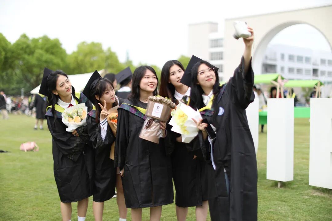 在学思楼前草坪上,上海对外经贸大学毕业生自拍合影,记录珍贵的友情