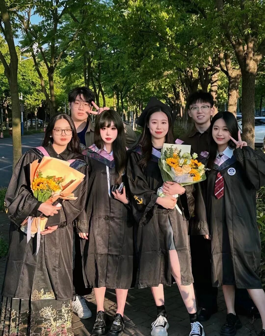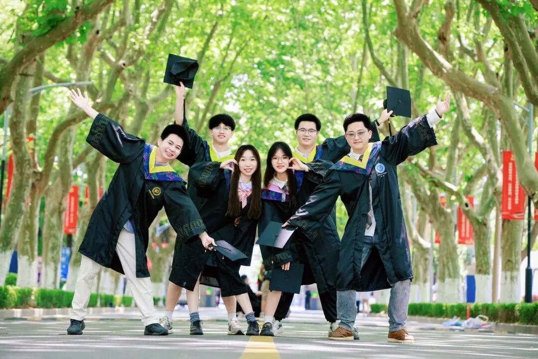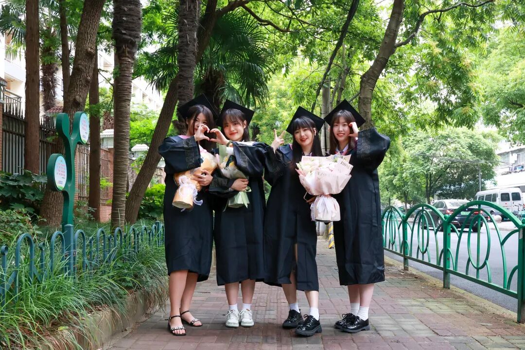 上海政法学院毕业生在学校林荫道上合影,共同奔向光辉灿烂的未来