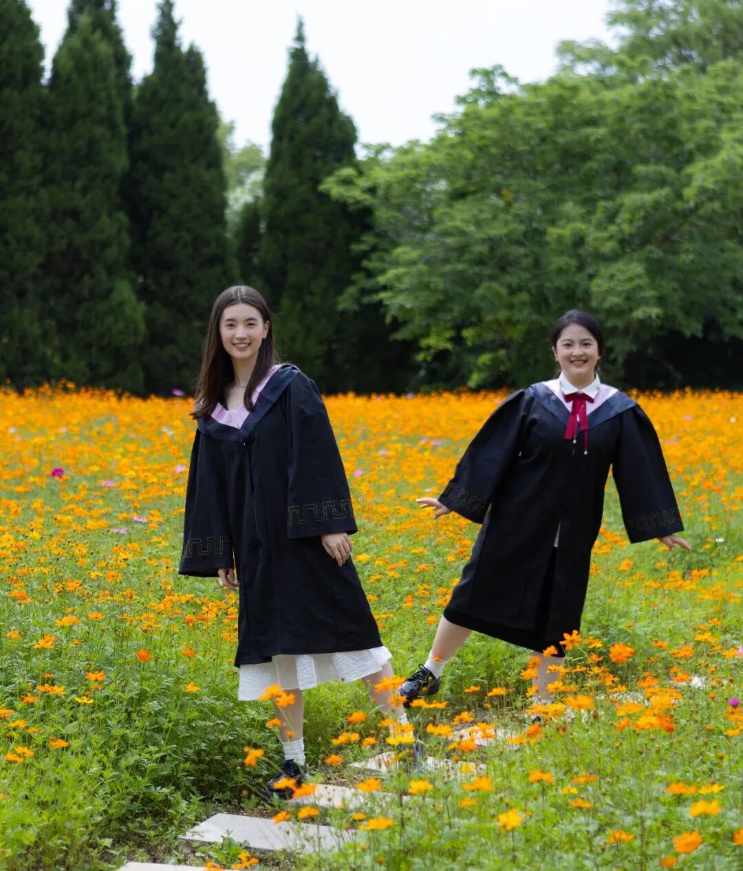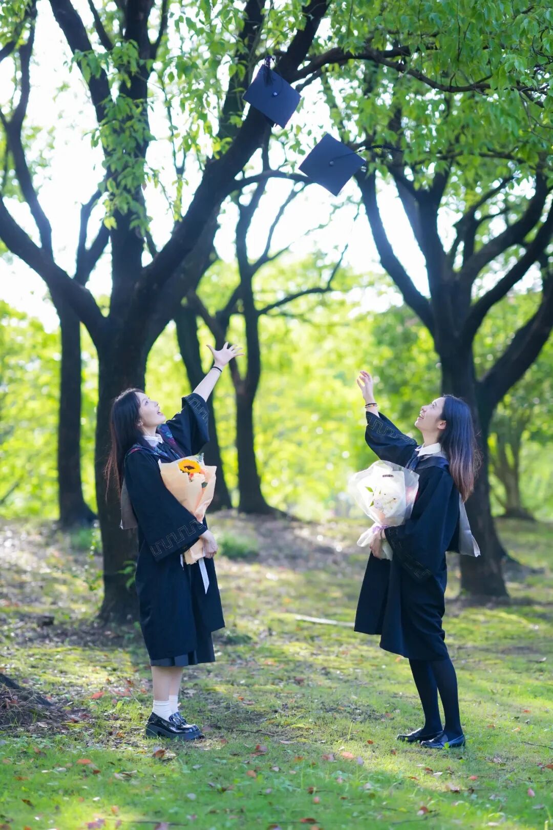 上海海关学院毕业生们在沿河小路边捧花合照,希望我们继续兴致盎然地与世界交手,一直走在开满鲜花的路上
