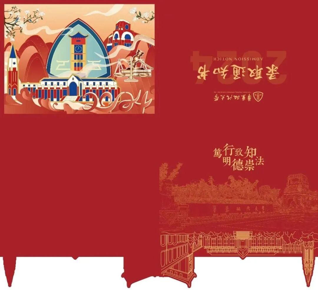华政园今年的录取通知书以“华政红”为主色调,采用三折页不规则裁切设计,兼具展示和收藏功能。开合之间,循序渐进,愿莘莘学子未来的每一步都脚踏实地。韬奋楼和明珠楼相接烫金设计的校徽和录取字样寓意“我们终将上岸,阳光万里”,“笃行致知 明德崇法”是每一名华政学子入学前的第一课。此外,叶青校长寄语华政人“学海无涯,开卷有益”,并精心挑选55本经典书籍,从古至今,由中到西,每本书都有专属二维码,扫码即可解锁阅读。16座标志性建筑+对应贴纸,随机掉落你的1个天选“地标”,不仅如此,每位新生还会随机获得行李牌。同时,学校预告了2024年华政园0001号录取通知书已名花有主,由刑事法学院侦查学专业的姚同学获得。