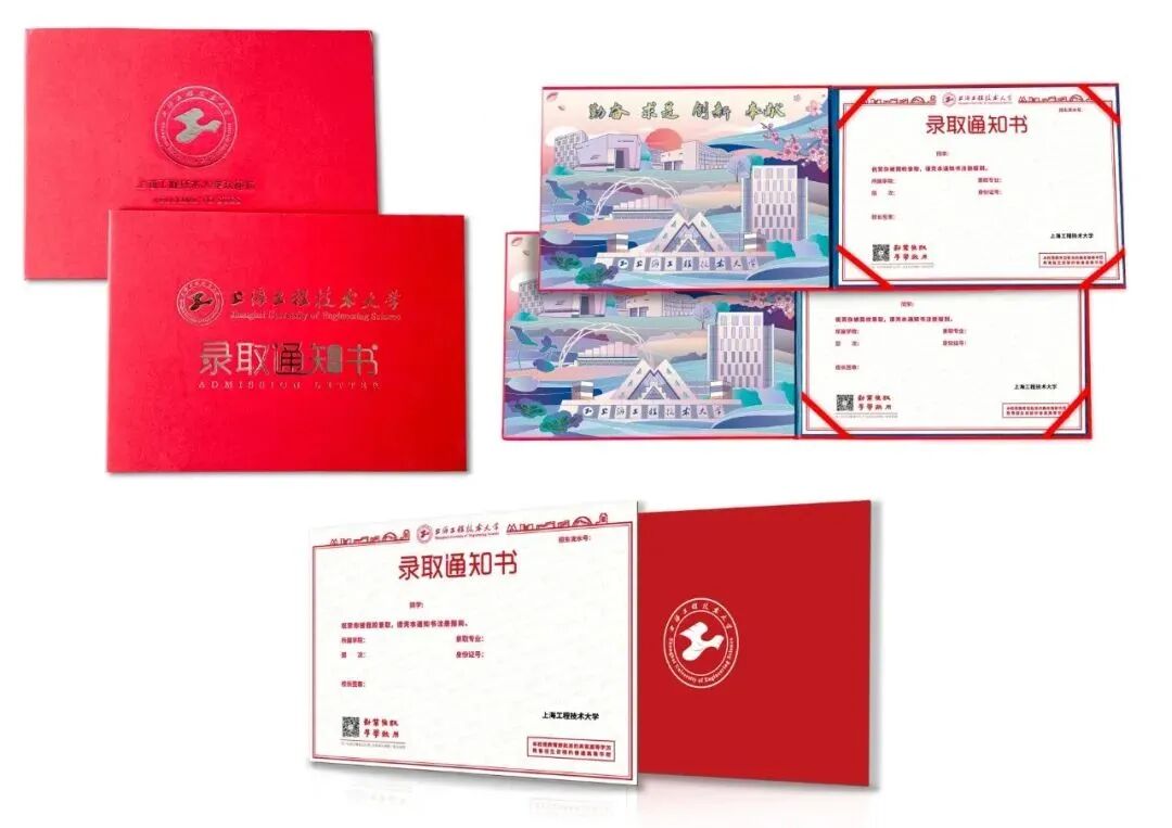 录取通知书巧妙融合了上工程的标志性建筑元素,更采用装饰艺术的独特视角,细腻勾勒,展现出学校深厚的文化底蕴,让每一位新生在初见之际,便能深刻感受到来自上工程的温馨祝福与殷切期望。每份录取通知书内,还精心附赠了两张专属于新生的校园风景“盲盒明信片”一张“致亲爱的家人”,承载着学子对家人的深深感激之情,鼓励学子们在成长的路上不忘亲恩;另一张“致四年后的自己”,则是对未来的一次深情寄语,引导新生思考规划,激励他们在大学四年里勇敢追梦,不负韶华。这不仅是一次感恩教育的温馨传递,更是对新生生涯规划的一次深刻启迪,让这份录取通知书不仅具有极高的纪念意义,更成为了值得一生珍藏的宝贵财富。