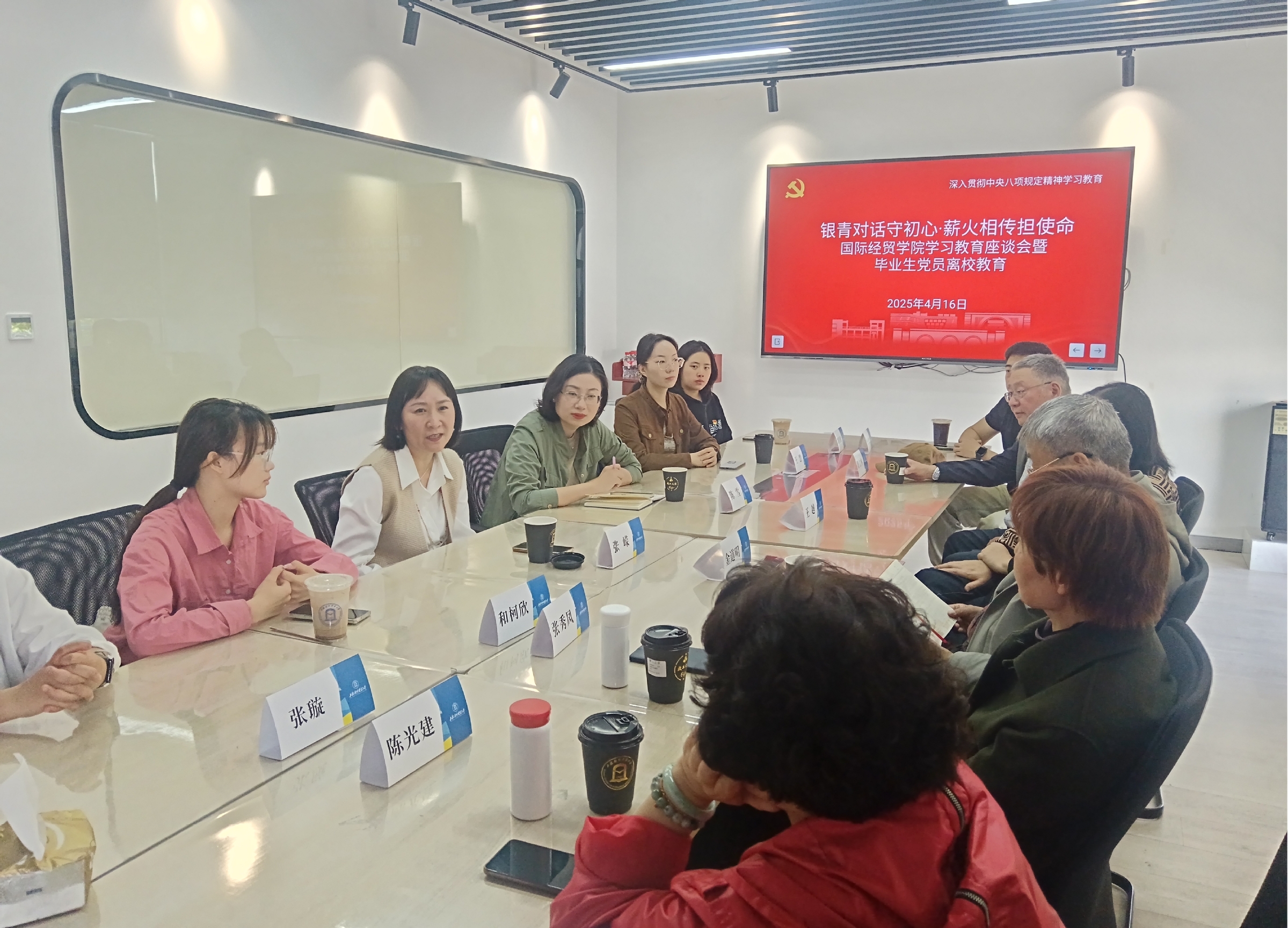 4月16日,国际经贸学院党委以“银青对话守初心·薪火相传担使命”为主题,邀请学校关工委秘书长金道明,学院老领导、老党员张秀凤、陈光建、王越、曹立林,组织学院毕业生党员、关工委青年学生委员等开展专题座谈会,通过“口述历史、案例共学、青银共创”三个模块,将离校教育、作风建设与基层党建工作有机融合,打造了一堂沉浸式党性教育课。座谈会由学院党委书记张嵘主持。学院党委副书记陈雪,学院专兼职组织员、离退休党委专职组织员等参加活动。今年恰逢学校65周年校庆,作为学校历史积淀深厚的国际经贸学院也将迎来建院65周年,原学院党委书记张秀凤、陈光建、王越老师讲述了学院传承创新发展的脉络,一代代经贸人在服务学生成长方面倾注的心血。作为“贸二代”的代表,毕业生党员张璇感慨:“我从小听父母讲他们在学校度过的美好时光,如今,作为新一代经贸青年,听老前辈们讲校史院史,分享服务学校发展的奋斗故事,这也是我们生动的党史教材。”围绕深入贯彻中央八项规定精神学习教育,活动以“亲历者说+践行者思”的双向对话模式增强代入感。关工委老同志们结合亲身经历,分享经贸人“任务面前多担一点、困难面前担重一点、责任面前主动一点”的优良传统。