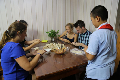 在中国传统文化体验环节中,国外学生来到附校学生家中,学习和体验包饺子。当一盘盘热腾腾的饺子端上餐桌,大家急不可耐地品尝起自己的劳动成果,脸上洋溢着满满的幸福。