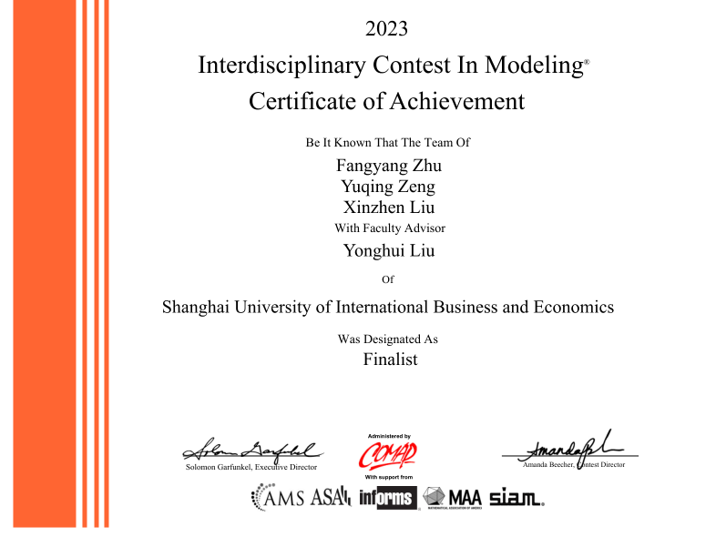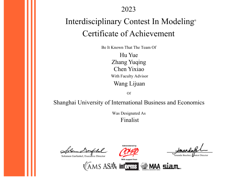 近日,2023年第39届美国大学生数学建模竞赛(MCM/ICM)成绩揭晓,我校学生再创佳绩,荣获国际特等奖提名奖3项(Finalist奖),国际一等奖4项(Meritorious奖),国际二等奖14项(Honorable奖),国际三等奖61项(Successful奖),其中获国际特等奖提名的三支参赛团队分别为:朱芳阳(20级国际经济与贸易)、曾雨青(20级国际经济与贸易)、刘鑫桢(20级国际经济与贸易)团队,指导教师:统计与信息学院刘永辉教授;胡悦(20级物流管理)、张雨青(21级数据科学与大数据技术)、陈易筱(21级国际投资)团队,指导教师:统计与信息学院王利娟副教授;华婧雯(20级金融学)、彭欣怡(19级贸易统计创新实验班)、顾博慧(20级金融学)团队,指导教师:统计与信息学院刘欣副教授。