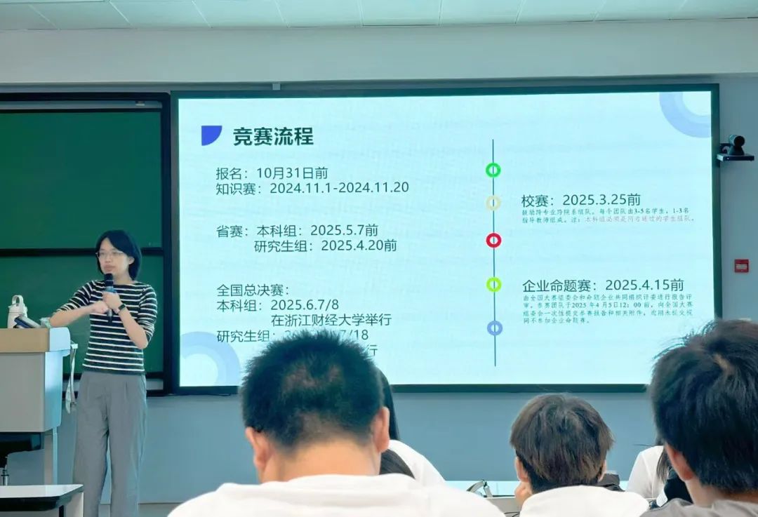 随后,邹老师详细介绍了竞赛的全流程,罗列出报名、校赛、省赛和全国总决赛的时间地点,为同学们分享了有关报名的具体流程。
