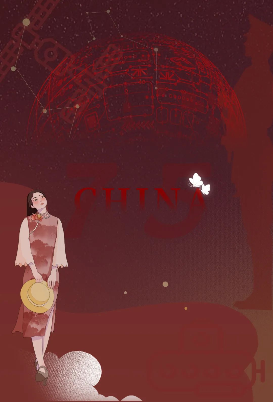 整张海报以中火红为底色,右上角飞驰的高铁代表着科技进步,右下角为饱满的麦穗,代表着新质生产力的突破及人民对美好生活的向往,中间为山云及穿插在山云间的楼宇,体现着中式浪漫。文字部分由两部分组成,左下角是被中国元素填充着的“75”,左上角写着”愿以吾辈之青春,捍卫盛世之华夏“,表达着我们对祖国母亲生日的祝福及吾辈青年愿为祖国献出青春的决心和意志。希望祖国越来越昌盛,人民越来越幸福。中华人民共和国万岁!