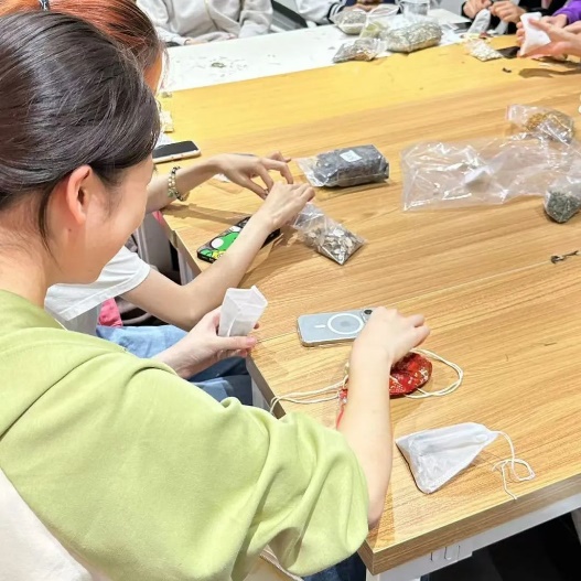 在了解了香囊的历史与种类之后,同学们纷纷开始了自己的制作香囊体验。活动现场洋溢着浓厚的艺术氛围,每个人都在尽情发挥自己的想象力和创造力,用多种多样的香料制作出独一无二的作品。在制作过程中,同学们互相交流、互相帮助,现场气氛热烈而融洽。通过这次制作香囊体验活动,同学们不仅锻炼了自己的动手能力和艺术创造力,更是在实践中感受到了团队合作的力量和乐趣。