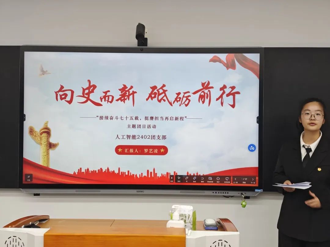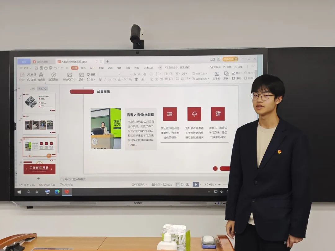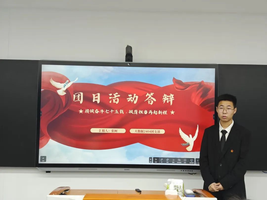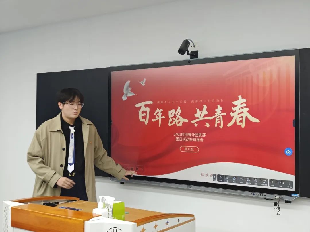 在主持人介绍答辩流程及规则后,答辩正式开始。参与答辩的27位团支部书记按照顺序依次上台展示汇报。过程中,各位团支书详细介绍了所在团支部团日活动的开展情况,充分体现了丰富多样的创意文化作品与开展过程中取得的成果经验。红色文创、知识问答、红色剧本杀、实地寻访手帐宣传海报、奋斗感悟、主题精讲团课、团支部共建回顾,公众号视频号运营,这些充实的成果内容彰显出每一个团日活动背后团支部书记与全体团支部成员的辛勤付出与协作精神。
