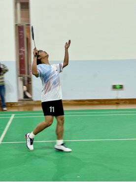 第三场为男子双打比赛,我方参赛选手为戴子豪同学与王徐睿同学。比赛一开始,二人的配合出现了些许小失误,让对手抓住了得分的机会。但二人迅速调整,展现出了十足的默契,攻守有序,在比分上占据了一定优势。随着比赛进入白热化,二人发挥稳定,最终以21:16的大比分,赢得了本场比赛的胜利。