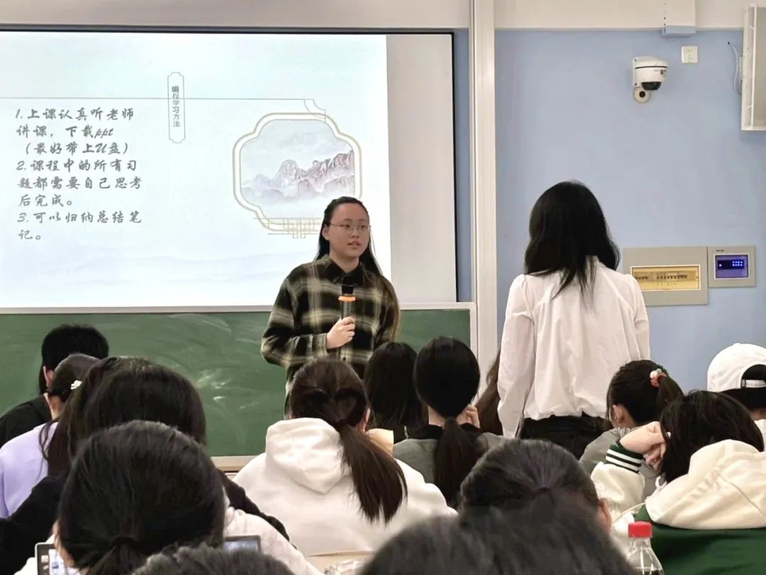 俞诗倩学姐向同学们介绍了计算机二级考试,包括其考试内容、要求、评分标准,以及各种计算机相关的比赛,如最近的上海市计算机应用能力大赛等,并鼓励同学们参加以提升个人能力。她也在学校计算机课程方面分享了自己的见解,比较了每门课程的不同点并给出选课建议。同时,学姐还详细地给出了编程课上和课下的学习方法,为学弟学妹的学习道路清扫障碍。