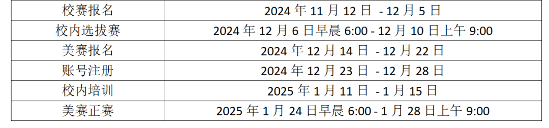 2025年美国大学生数学建模竞赛时间为2025年1月24日6:00-1月28日9:00