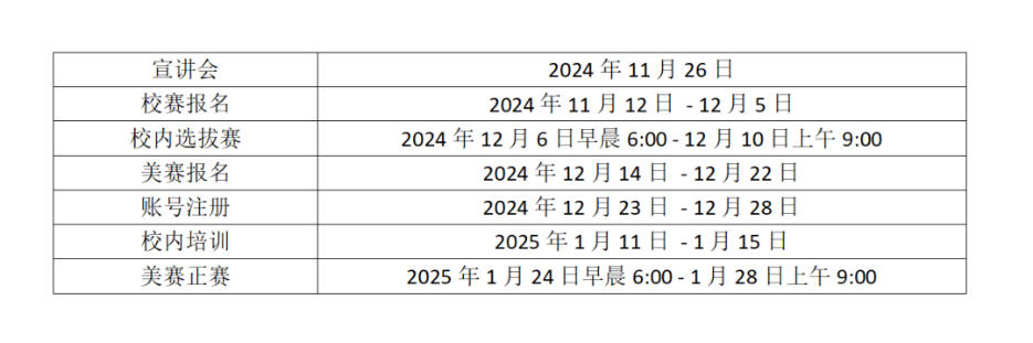 为鼓励同学们参加、适应并了解美赛,作为美赛的一个演练,我校将在2024年12月6日上午6:00 - 2024年12月10日上午9:00进行美赛校内选拔赛。