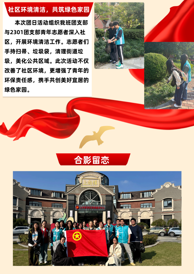 活动内容:经济统计2302团支部与经统2301团支部的成员们一同前往上尚缘社区,参与社区环境清洁志愿服务活动。在社区工作人员的安排下被分成若干小组,各自负责不同区域的清洁工作,走遍社区每个角落,包括街道、绿化带、广场等公共区域,认真清理垃圾和杂物,确保每个区域都干净整洁。