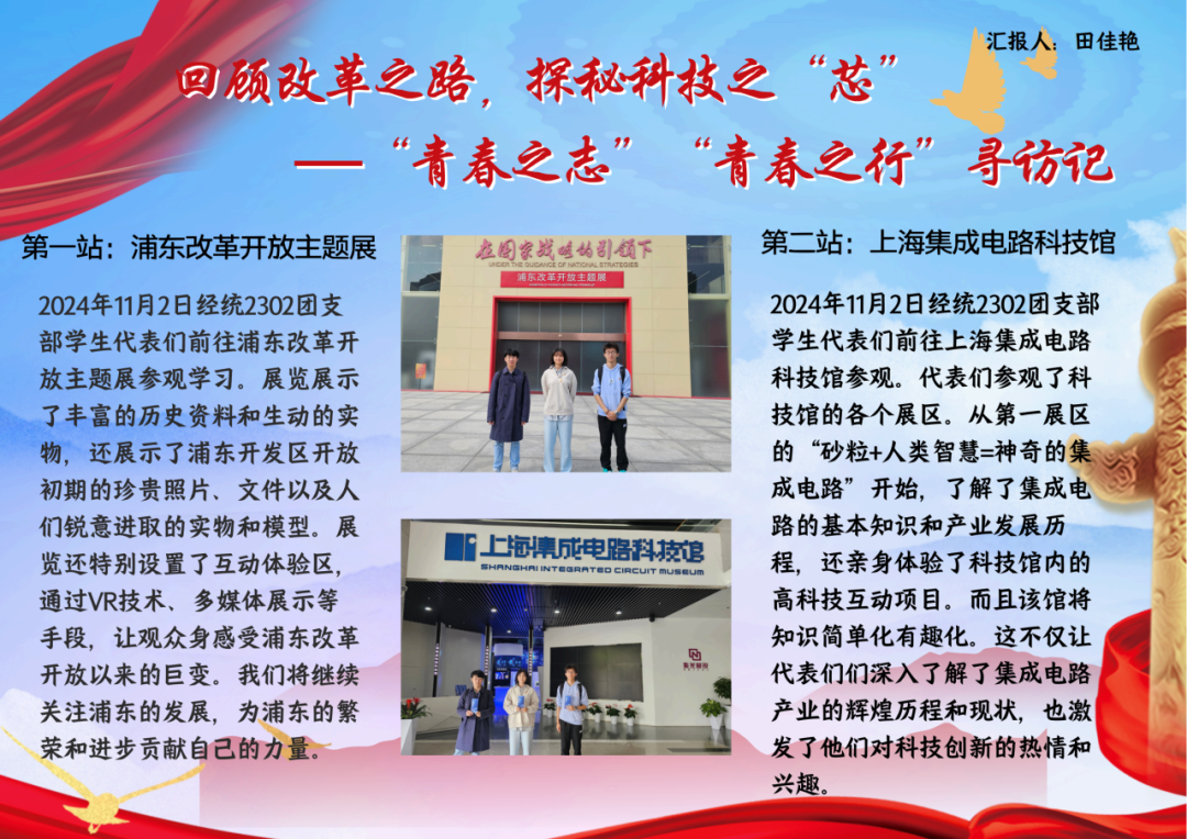 为了让每位团支部的同学都能有效参与寻访活动并深入地了解国家芯片等方面的科技发展历程以及与本专业对应的未来发展。本支部于2024年11月开展了“青春之行·实地寻访”科技寻访活动,由代翊群、王子洋、詹皓丞三人组成红色寻访小分队,进行上海集成电路科技馆实地走访学习。其余团支部同学根据团日活动官方的寻访二维码进行了线上的参观学习并制作了寻访笔记。