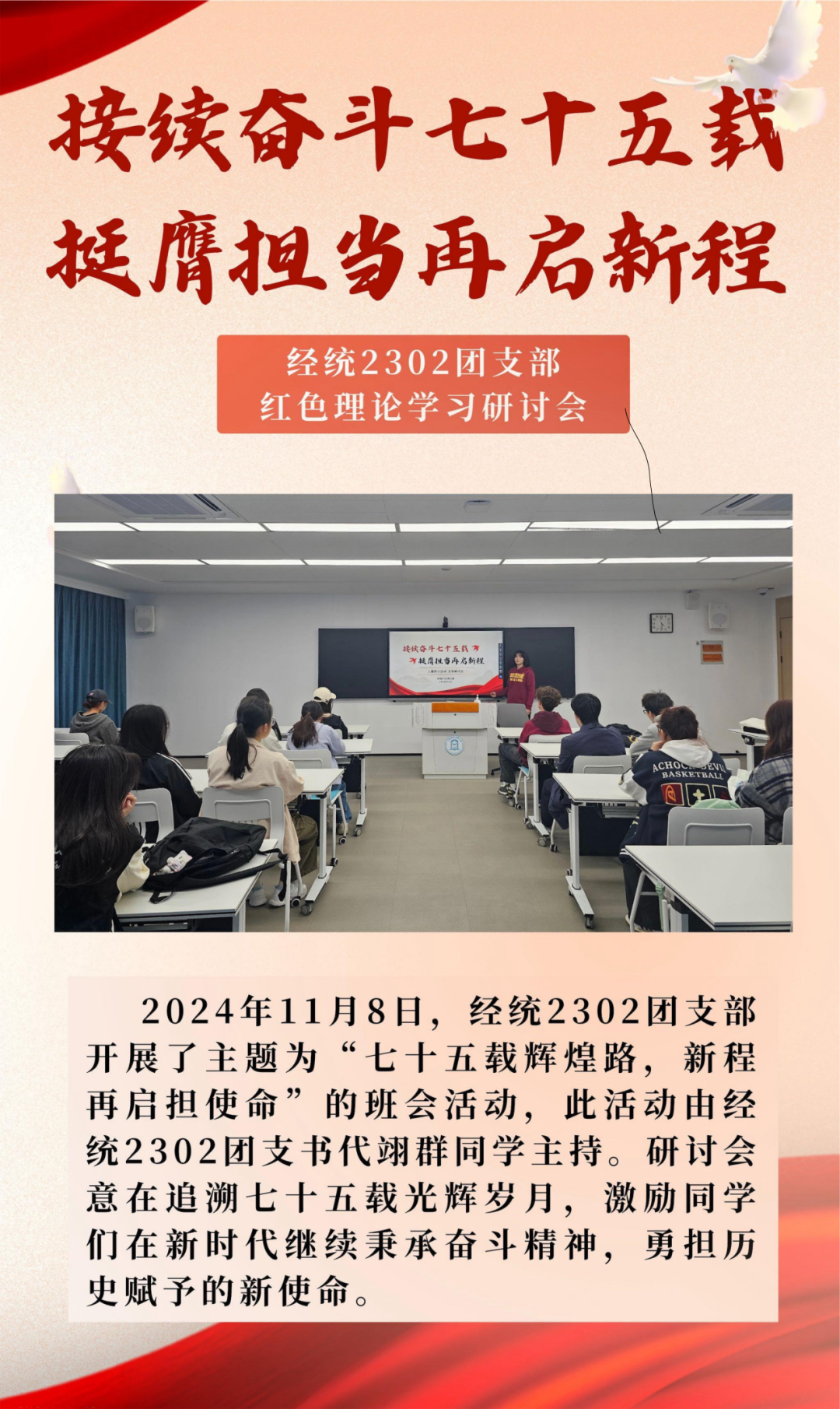 为深入学习贯彻习近平新时代中国特色社会主义思想,全面贯彻党的二十大和二十届三中全会精神,认真做好面向广大团员和青年开展学习贯彻习近平新时代中国特色社会主义思想主题教育,着力加强对共青团员政治锻造,加强对广大青年政治引领,充分激发新时代中国青年在强国建设、民族复兴伟业中挺膺担当,奋力书写为中国式现代化挺膺担当的青春篇章。经统2302团支部于2024—2025学年第一学期开展“接续奋斗七十五载挺膺担当再启新程”主题团日活动。