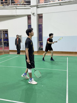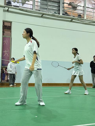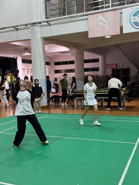 本轮女双比赛,我方派出的是撒讯同学和叶子馨同学。二人在场上配合默契,尝试多变的战术,很快便找到了合适的进攻方式,不断得分。在比赛中后端,对手似乎也找到了一定的状态,主动发起进攻,但在二人的严防死守下,防线未能被瓦解,比分逐渐被拉大。最终,我方以21:12的大比赛,赢得了本学期最后一场比赛的胜利,循环赛圆满落幕!