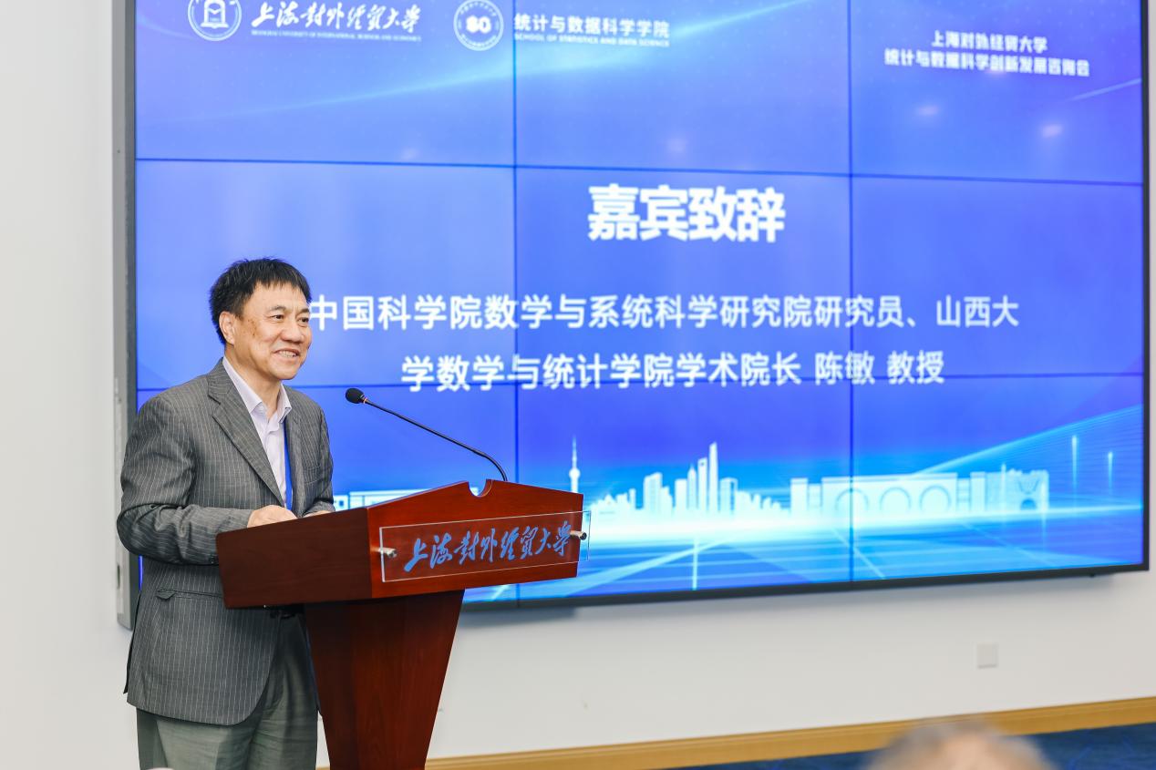 嘉宾致辞环节,中国科学院研究员、山西大学数学与统计学院学术院长陈敏教授指出,学院的学科布局完整,融合发展潜力巨大,希望未来统计学科力量能够联合起来使学科建设独立、自主、自强、自信。中国现场统计研究会秘书长、北京工业大学张忠占教授强调上海是改革开放的桥头堡和经济建设重点区域,上海对外经贸大学的统计学科发展具有天时地利人和的优势,预祝学院未来越办越好。中国现场统计研究会资源与环境统计分会理事长、中国科学院研究员孙六全希望学院能够加强统计学科建设,不断提高学术地位和学界声望,围绕博士点建设加速科研成果转化和高层次人才培养。国际数理统计学会会士、香港中文大学宋心远教授期待学院进一步加强国际合作,结合地方资源优势,努力建设有上经贸大特色的统计与数据科学人才高地和科研高地。