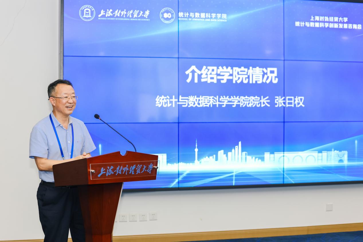 统计与数据科学学院院长张日权对学院情况进行介绍。他指出,统计与数据科学学院作为学校唯一的理工类学院,将坚持“理工固本、数智铸魂”的办学理念,加强多学科交叉融合,形成更加完善、更具活力的学科生态系统,着力培养具有家国情怀、国际视野的交叉复合型统计与数据科学人才,积极为上海经济发展提供智力支持。