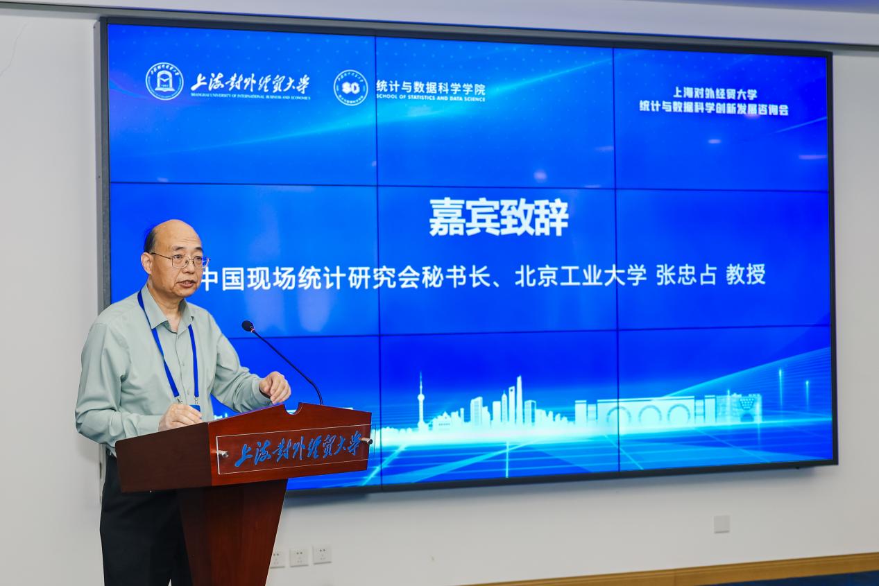 徐永林教授代表学校向与会专家学者表示热烈欢迎,向长期以来关心支持学校发展的各位领导、专家表示感谢。他简要介绍了学校的发展历程和“外”“经”“贸”发展特色,重点介绍了学校统计学科建设近年来取得的成就。他强调,不久前学校决定将统计与信息学院更名为统计与数据科学学院意义重大,标志着学校顺应新时代学科交叉融合发展趋势,紧密对接国家战略需求人才和上海发展需要。学院未来发展要充分服务“数字中国”建设的战略实施、服务上海建设国际科技创新中心的历史使命、服务学校深化教育综合改革的目标任务。他期待未来统计与数据科学学院能够在学科布局、人才培养、科研创新、社会服务等方面开启崭新征程。