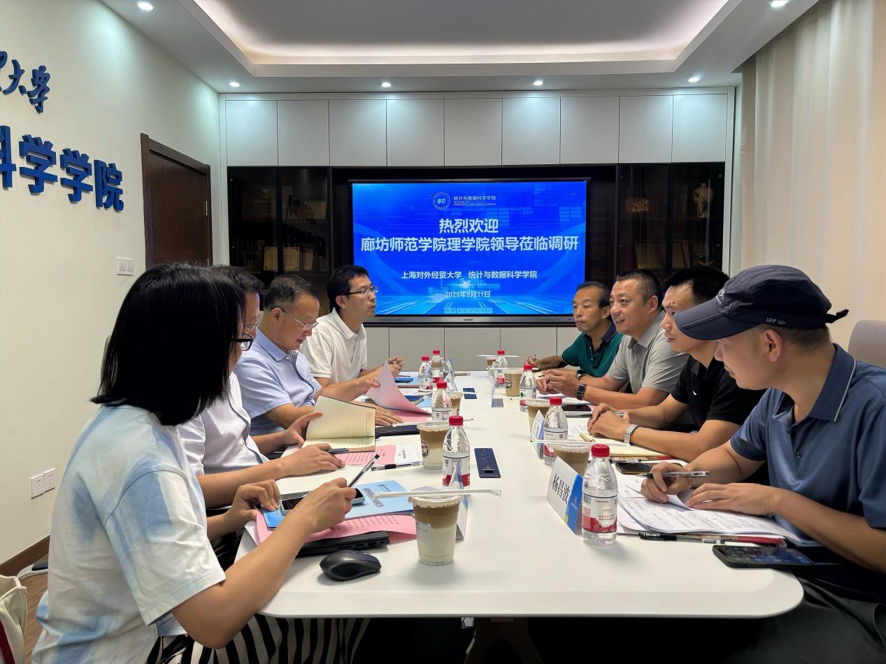 2025年9月11日下午,廊坊师范学院理学院院长、科研处处长岳孟田教授一行莅临我院,就统计学学科建设、数据科学与大数据技术专业以及应用统计专业硕士建设等开展专题调研交流。统计与数据科学学院院长张日权、副院长李睿、赵海琼,应用统计专硕主任、数理统计系系主任范彩云参加本次调研活动。会议由李睿主持。
