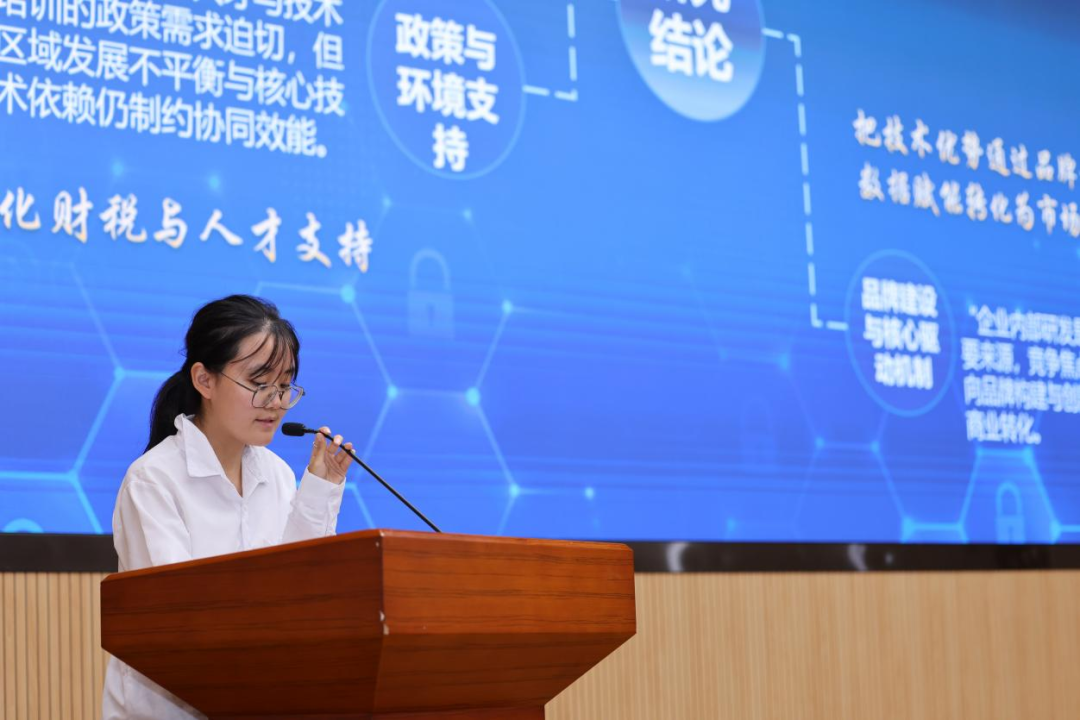 会上还进行了调研队伍成果展示。统计与数据科学学院本科生王晨、研究生江宇豪、国际经贸学院本科生周禹璇分别以《新质生产力视角下低空经济高质量发展路径研究—基于长三角地区的实证调研》《科技创新型企业新质生产力影响因素与路径机制研究》《科技创新驱动新质生产力:长三角企业空间异质性、障碍识别与品牌-数字化赋能路径》为主题,就调研过程、分析工具、研究结论、政策等进行了成果汇报。
