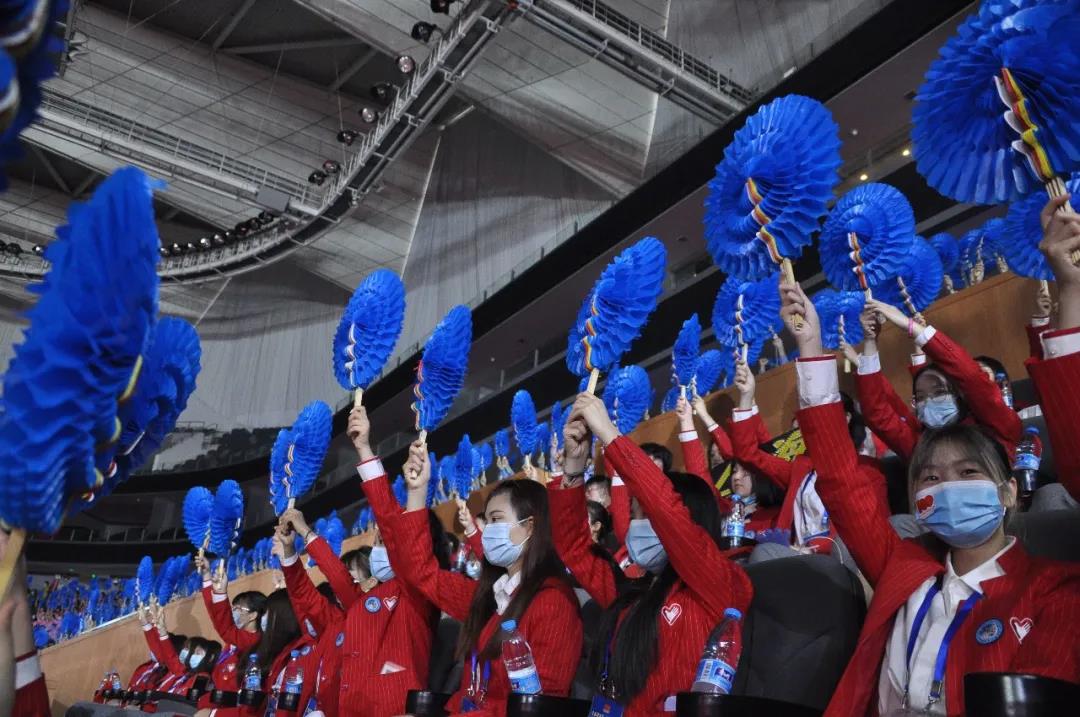 我校40名进博会志愿者代表前往现场观看,年轻的力量和百年波澜相遇,共舞青春的翅膀,书写新时代华章。台下共同挥舞红旗和花球,现场气氛超级热烈!